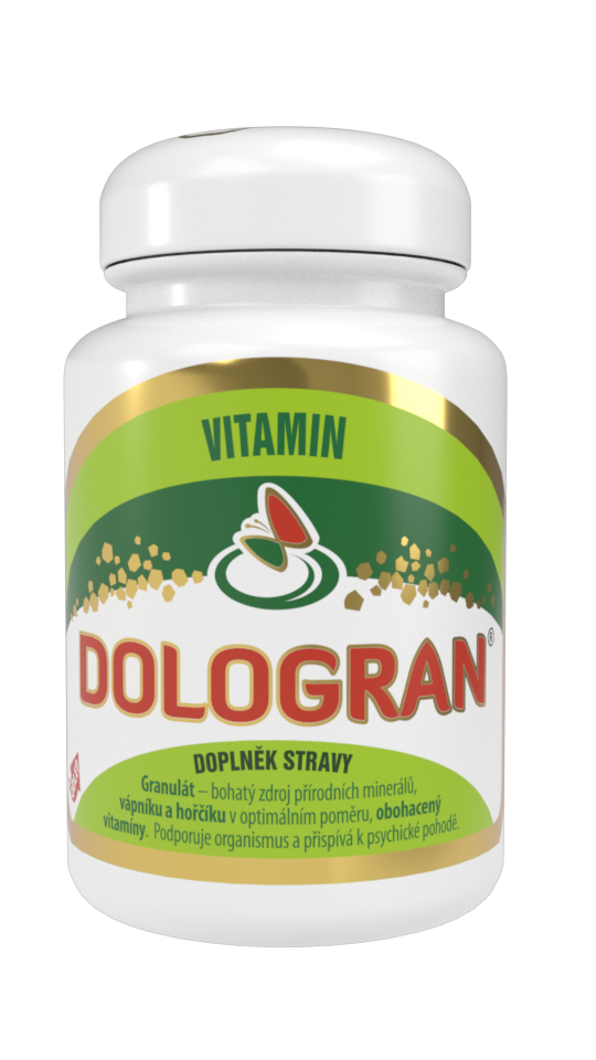 Doplněk stravy přispívá ke správnému vývoji a udržení zdravých kostí, zubů a k normální činnosti svalů. Vápník napomáhá ke správné funkci nervových přenosů a Hořčík ke snížení míry únavy, vyčerpání a k psychické pohodě. DOLOGRAN Vitamin je navíc obohacen o vitamíny B1, B6, E, Beta karoten, které zajišťují optimální využití minerálních látek v organismu. Vitamín B12 a kyselina listová podporují správnou imunitu a hladinu homocysteinu.